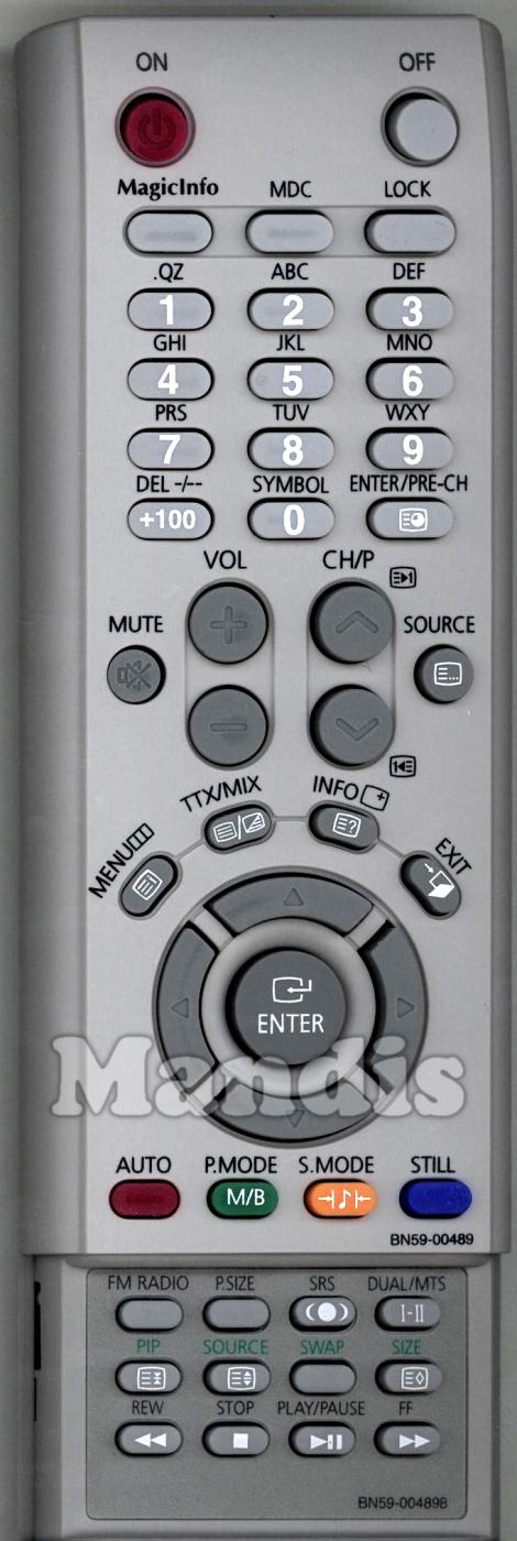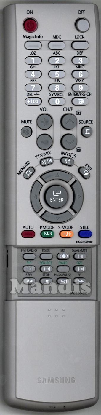 On, Off, MagicInfo, MDC, Lock, 1, 2, 3, 4, 5, 6, 7, 8, 9, 0, +100 / -/--, Enter / Pre-CH, Mute, Vol+, Vol-, CH/P+, CH/P-, Source, Menu, TTX/Mix, Info, Exit, Up, Left, Enter, Right, Down, Red / Auto, Green / M/B / P.Mode, Yellow / S.Mode, Blue / Still, FM Radio, P.Size, SRS, Dual / MTS, PIP, PIP Source, PIP Swap, PIP Size, << Rew, Stop, Play / Pause, FF >>