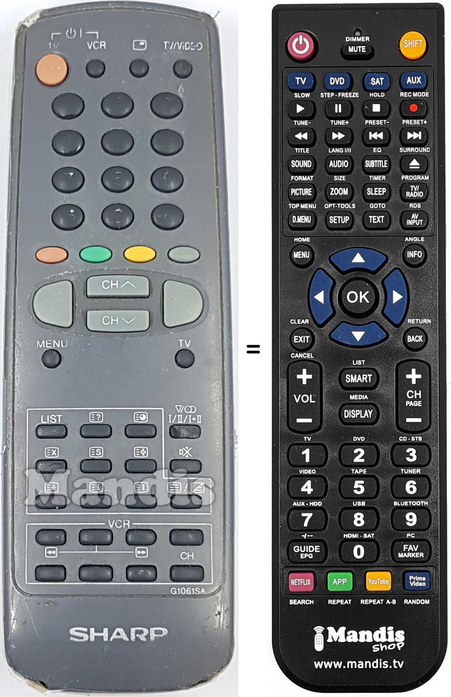 Il telecomando equivalente esegue tutte le funzioni, anche quando il controllo originale controlla vari dispositivi, nel controllo equivalente è possibile programmare diversi dispositivi (TV, DVD, SAT e AUX) in questo modo è possibile includere tutte le funzioni del telecomando originale. Se vedi il manuale dei tasti (istruzioni sul telecomando) puoi verificare che tutte le funzioni siano presenti.