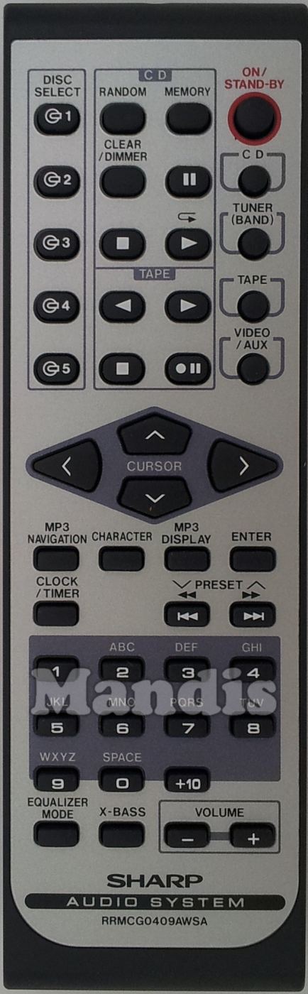On/Stand-by, Disc Select 1, Disc Select 2, Disc Select 3, Disc Select 4, Disc Select 5, Random CD, Memory CD, Pause CD, Clear/Dimmer CD, Stop CD, Play CD, < Tape, > Tape, Rec/Pause Tape, Stop Tape, CD, Tuner/Band, Tape, Video/AUX, Up, Down, Right, Left, MP3 Navigation, Character, MP3 Display, Enter, Clock/Timer, I<< / Preset Down / <<, >>I / Preset Up / >>, 1, 2, 3, 4, 5, 6, 7, 8, 9, 0, +10, Vol+, Vol-, X-Bass, Equalizer Mode