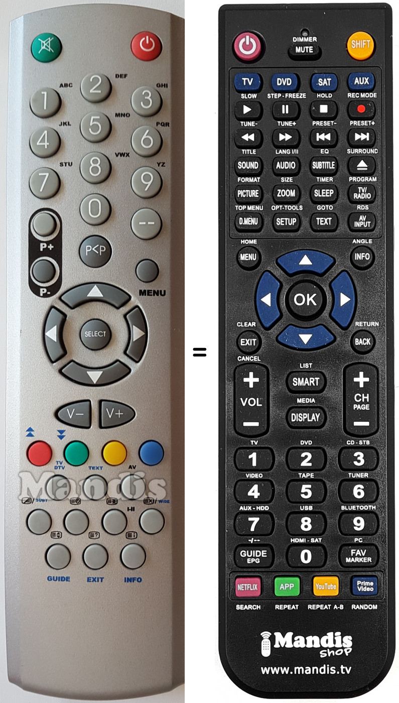 Il telecomando equivalente esegue tutte le funzioni, anche quando il controllo originale controlla vari dispositivi, nel controllo equivalente è possibile programmare diversi dispositivi (TV, DVD, SAT e AUX) in questo modo è possibile includere tutte le funzioni del telecomando originale. Se vedi il manuale dei tasti (istruzioni sul telecomando) puoi verificare che tutte le funzioni siano presenti.