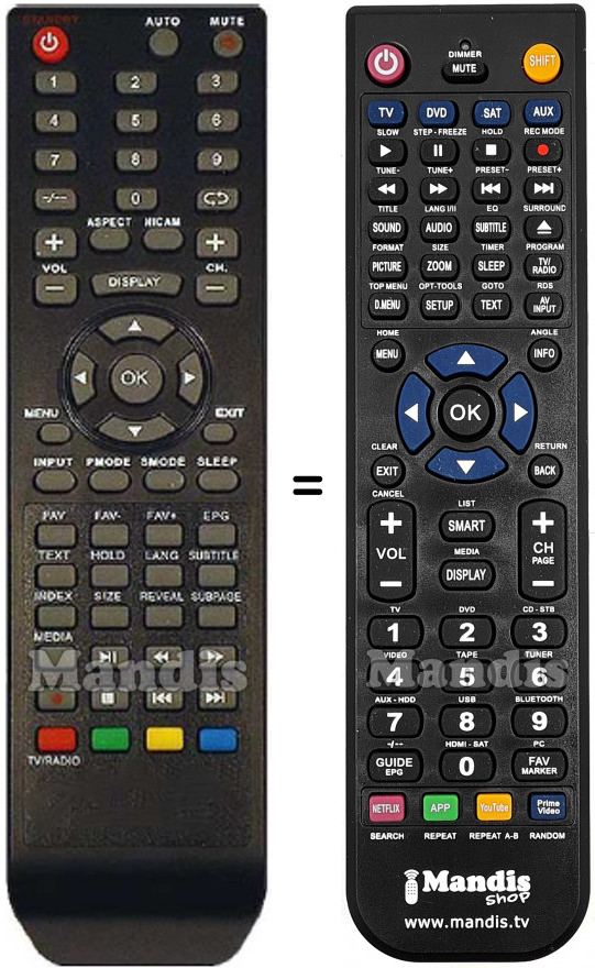 Di seguito, vi mostreremo la corrispondenza tra ciascun pulsante del telecomando originale e il pulsante che svolge la stessa funzione sul telecomando di sostituzione. In alcuni casi, potrebbe essere necessario premere il tasto SHIFT prima di premere un altro pulsante per eseguire determinate azioni. Queste funzioni aggiuntive sono spesso poco utilizzate e sono incluse per facilitare la comprensione del telecomando di sostituzione, o perché il telecomando originale ha più pulsanti rispetto al suo equivalente.