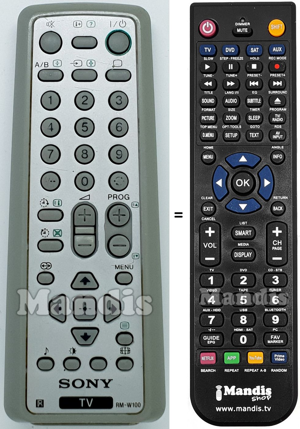 Questo telecomando sostituisce completamente il tuo RM-W100 (147800711) e offre tutte le funzioni dell'originale.