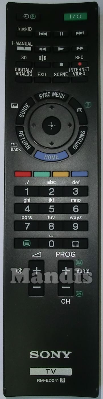 INPUT, POWER, TRACK ID, I<<, PAUSE, >>I, I MANUAL, <<, PLAY, >>, 3D, [+], STOP, REC, DIGITAL/ ANALOG, EXIT, SCENE, INTERNET VIDEO, OK, UP, DOWN, RIGHT, LEFT, SYNCMENU, HOME, OPTIONS, [i+]/[?], GUIDE, RETURN/ BACK, RED, GREEN, YELLOW, BLUE, 1, 2, 3, 4, 5, 6, 7, 8, 9, 0, [≡], [...], MUTE, AUDIO, VOL+, VOL-, Prog/CH+, Prog/CH-