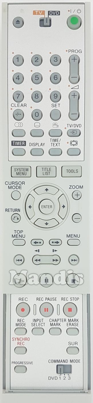 Power, Eject, 1, 2, 3, 4, 5, 6, 7, 8, 9, 0, -/-- / Clear, SET, Prog +, Prog -, Vol +, Vol -, Audio, Subtitles, Video, TV / DVD, Timer, Display, Time / Text, Aspect, System Menu, Title List, Tools, Cursor Mode, Zoom +, Zoom -, Up, Down, Right, Left, Enter, Return, Top Menu, <-·, ·->, Menu, I<<, << / <I, >> / I>, >>I, Play, Pause, Stop, Rec, Rec Pause, Rec Stop, Rec Mode, Input Select, Chapter Mark, Mark Erase, Synchro Rec, Sur, Progressive