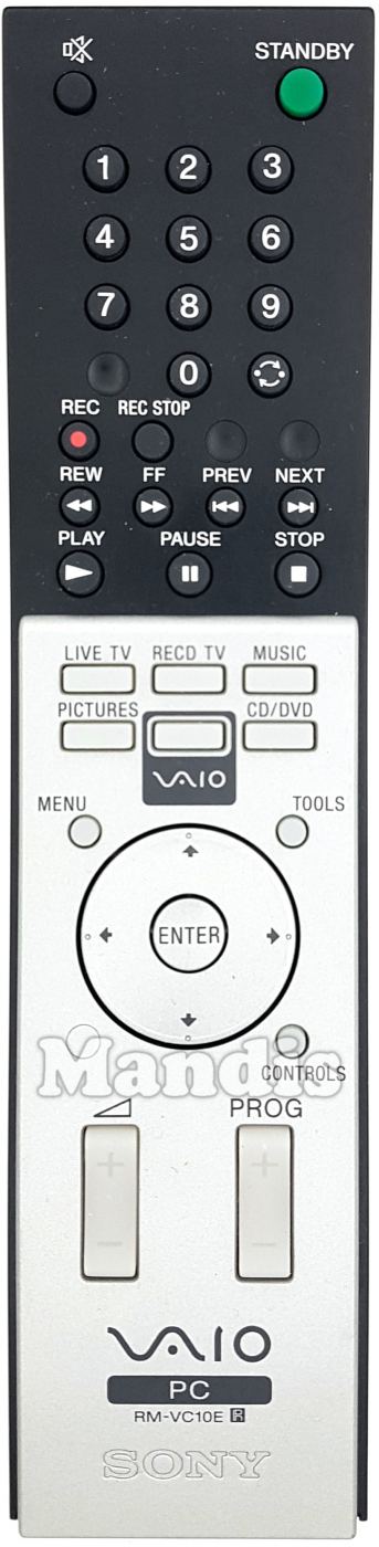 Standby, Mute, 1, 2, 3, 4, 5, 6, 7, 8, 9, 0, Recall, REC, REC Stop, << REW, >> FF, I<< Prev, >>I Next, Play, Pause, Stop, Live TV, RECD TV, Music, Pictures, VAIO, CD / DVD, Menu, Tools, Up, Left, Enter, Right, Down, Vol+, Vol-, Prog+, Prog-, Controls