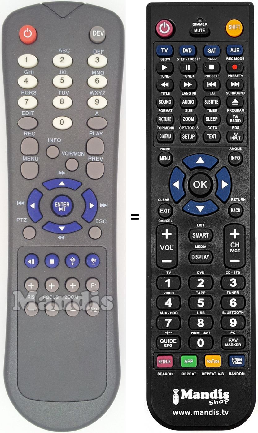 Il telecomando equivalente esegue tutte le funzioni, anche quando il controllo originale controlla vari dispositivi, nel controllo equivalente è possibile programmare diversi dispositivi (TV, DVD, SAT e AUX) in questo modo è possibile includere tutte le funzioni del telecomando originale. Se vedi il manuale dei tasti (istruzioni sul telecomando) puoi verificare che tutte le funzioni siano presenti.