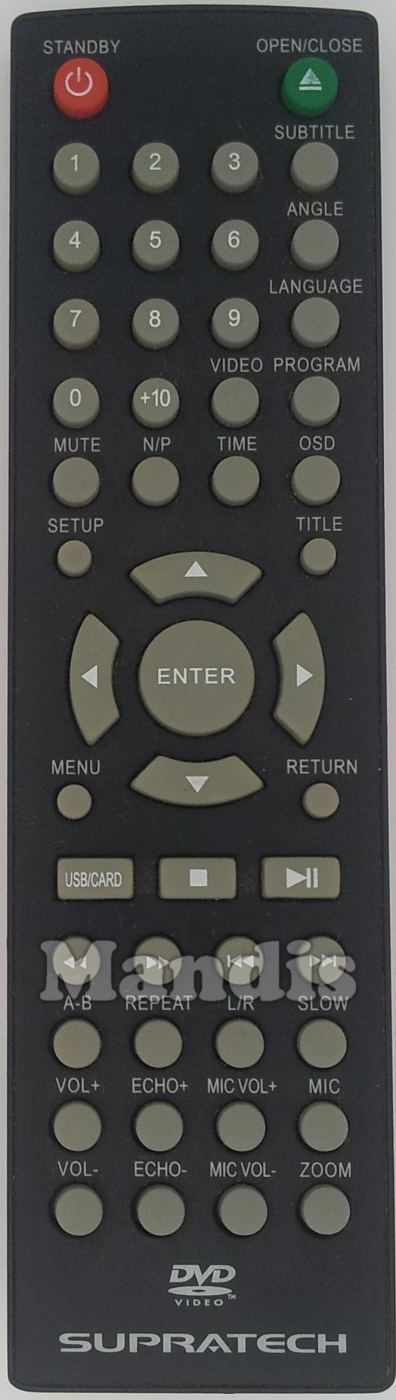 Power/Standby, Open/Close, 1, 2, 3, 4, 5, 6, 7, 8, 9, 0, +10, Subtitle, Angle, Language, Video, Program, Mute, N/P, Time, OSD, Setup, Title, Up, Down, Left, Right, Enter, Menu, Return, USB/Card, Stop, Play/Pause, <<, >>, I<<, >>I, A-B, Repeat, L/R, Slow, Vol+, Echo+, Mic Vol+, MIC, Vol-, Echo-, MIC Vol-, Zoom
