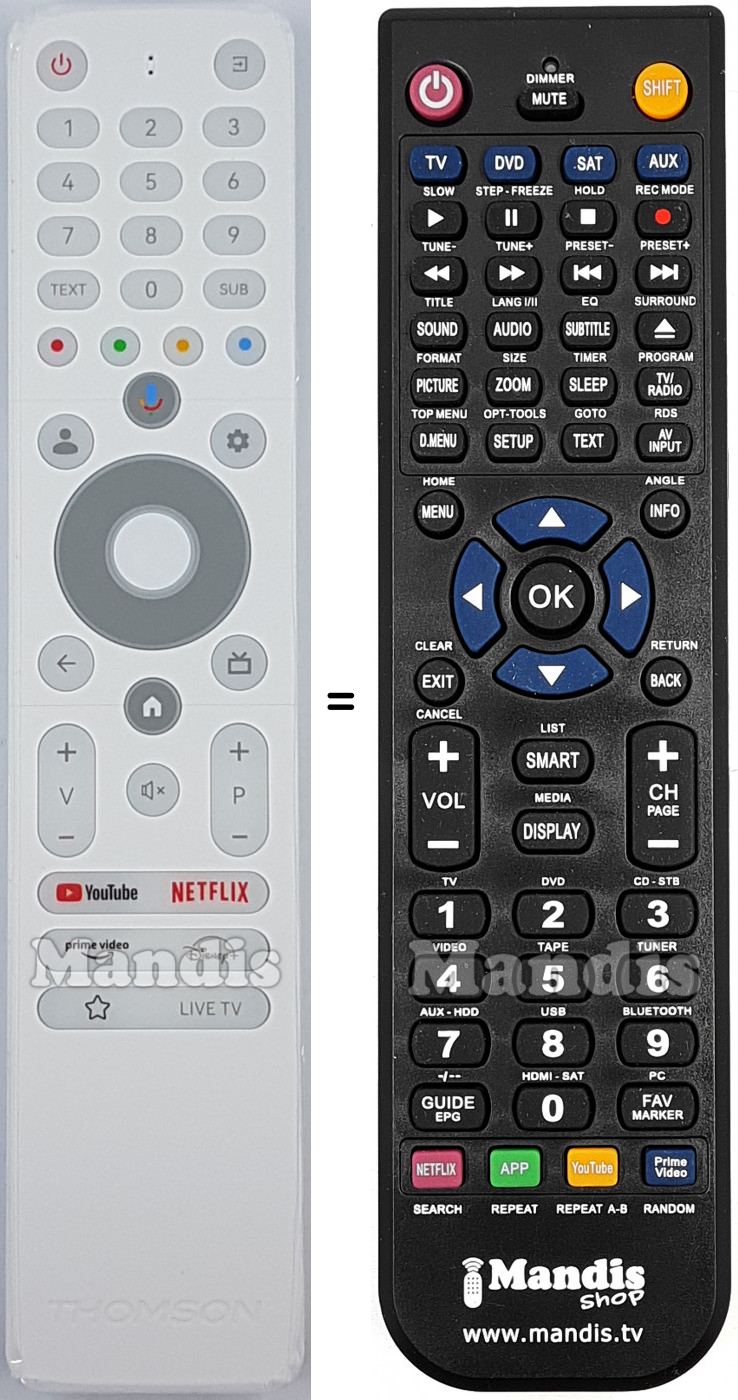 Di seguito, vi mostreremo la corrispondenza tra ciascun pulsante del telecomando originale e il pulsante che svolge la stessa funzione sul telecomando di sostituzione. In alcuni casi, potrebbe essere necessario premere il tasto SHIFT prima di premere un altro pulsante per eseguire determinate azioni. Queste funzioni aggiuntive sono spesso poco utilizzate e sono incluse per facilitare la comprensione del telecomando di sostituzione, o perché il telecomando originale ha più pulsanti rispetto al suo equivalente.