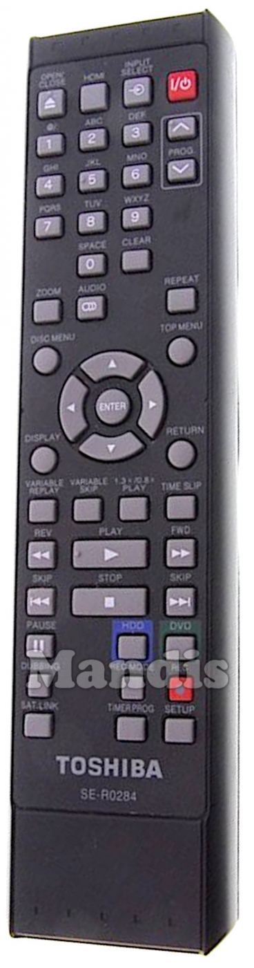 Power, Input select, HDMI, Open / Close, Prog+, Prog-, 1, 2, 3, 4, 5, 6, 7, 8, 9, 0, Clear, Zoom, Audio, Repeat, Disc Menu, Top Menu, Up, Left, Enter, Right, Down, Display, Return, Variable Replay, Variable Skip, 1.3x/0.8x Play, Time Slip, REV, Play, FWD, I<< Skip, Stop, Skip >>I, Pause, Dubbing, Sat Link, HDD, DVD, Rec Mode, Rec, Timer Prog, Setup