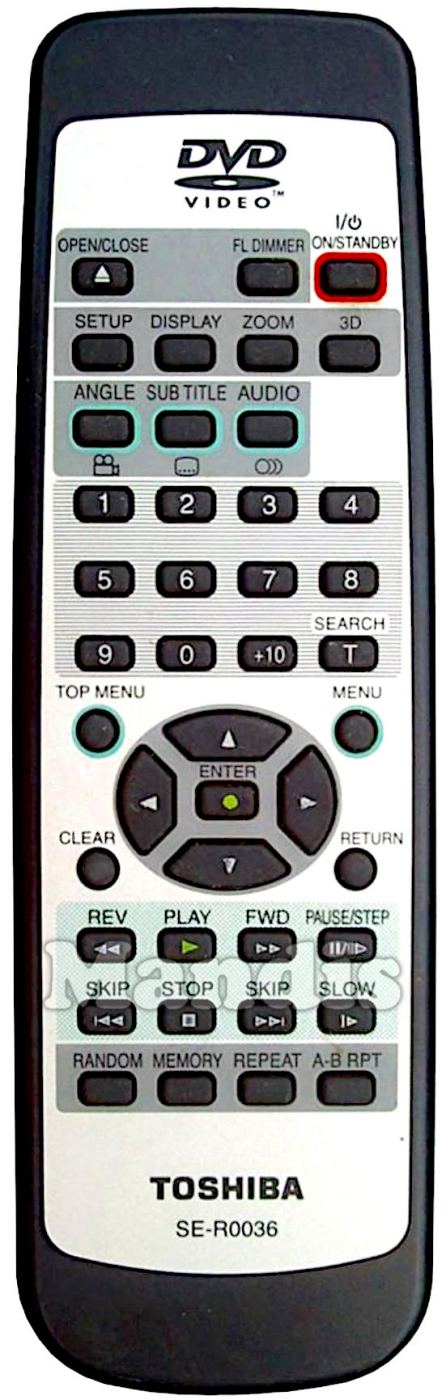 On / Standby, Open / Close, FL Dimmer, Setup, Display, Zoom, 3D, Angle, Subtitle, Audio, 1, 2, 3, 4, 5, 6, 7, 8, 9, 0, +10, T / Search, Top Menu, Menu, Up, Left, Right, Down, Enter, Clear, Return, REV, Play, FWD, Pause / Step, I<< Skip, Stop, Skip >>I, Slow, Random, Memory, Repeat, A-B RPT