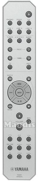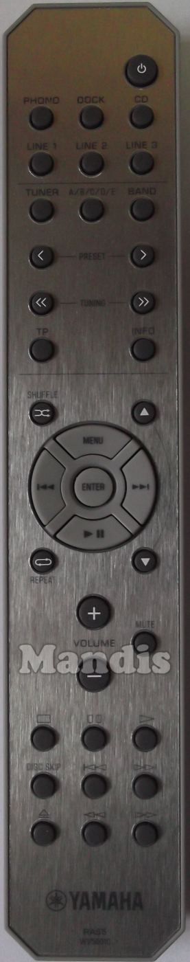 Questo telecomando ha i seguenti tasti: POWER, PHONO, DOCK, CD, LINE 1, LINE 2, LINE 3, TUNER, A/B/C/D/E, BAND, Preset Left, Preset Right, << Tuning, >> Tuning, TP, INFO, SHUFFLE, UP, REPEAT, DOWN, ENTER, MENU, PLAY/PAUSE, >>I, I<<, VOL+, VOL-, MUTE, STOP, PAUSE, PLAY, DISC SKIP, I<<, >>I, EJECT, <<, >>